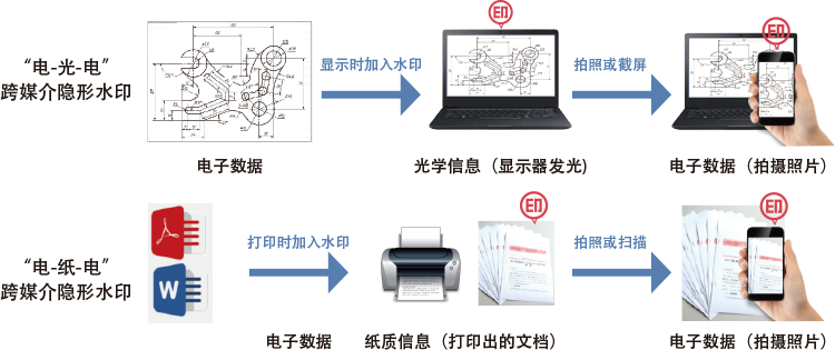 跨媒介隐形水印技术是一种特殊的数字水印技术,指的是在电子数据中加入人们不可感知的数字水印,该电子数据通过屏幕显示、打印机打印转换成光学信息和纸质信息,在对屏幕或纸质文档拍照、扫描形成的电子数据图像中仍包含原先嵌入的数字水印。