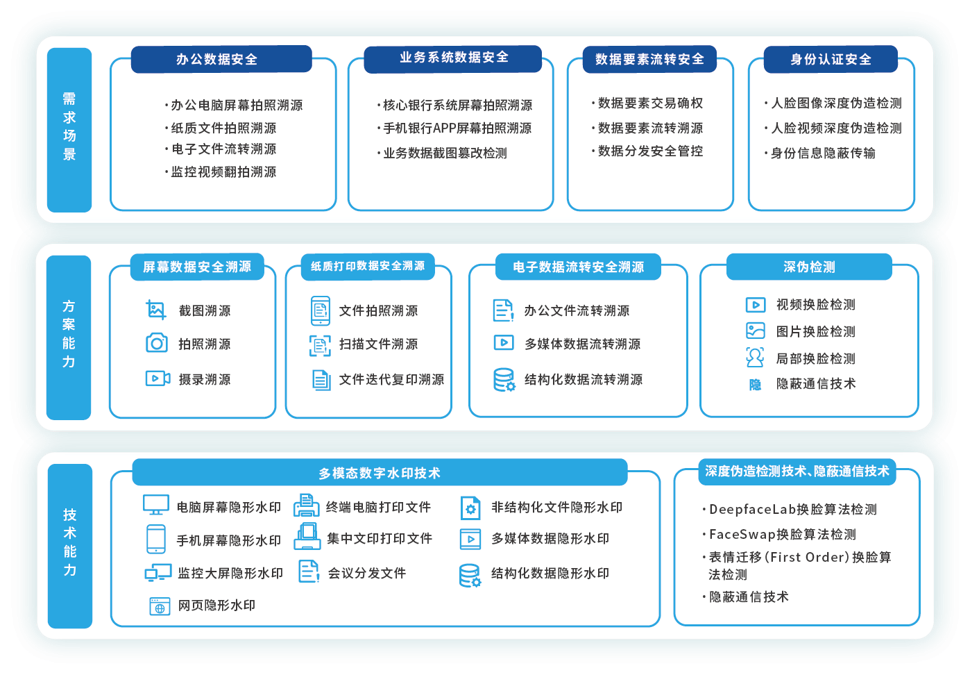 通过在办公电脑屏幕、手机屏幕、打印文件、电子文件中嵌入具有溯源标识的隐形水印,一旦对屏幕、打印文件、电子文件进行拍照/截图/扫描/违规转发,发生数据泄露事件后,可提取隐形水印信息,快速精准定位数据泄露源头,保护金融办公数据安全。