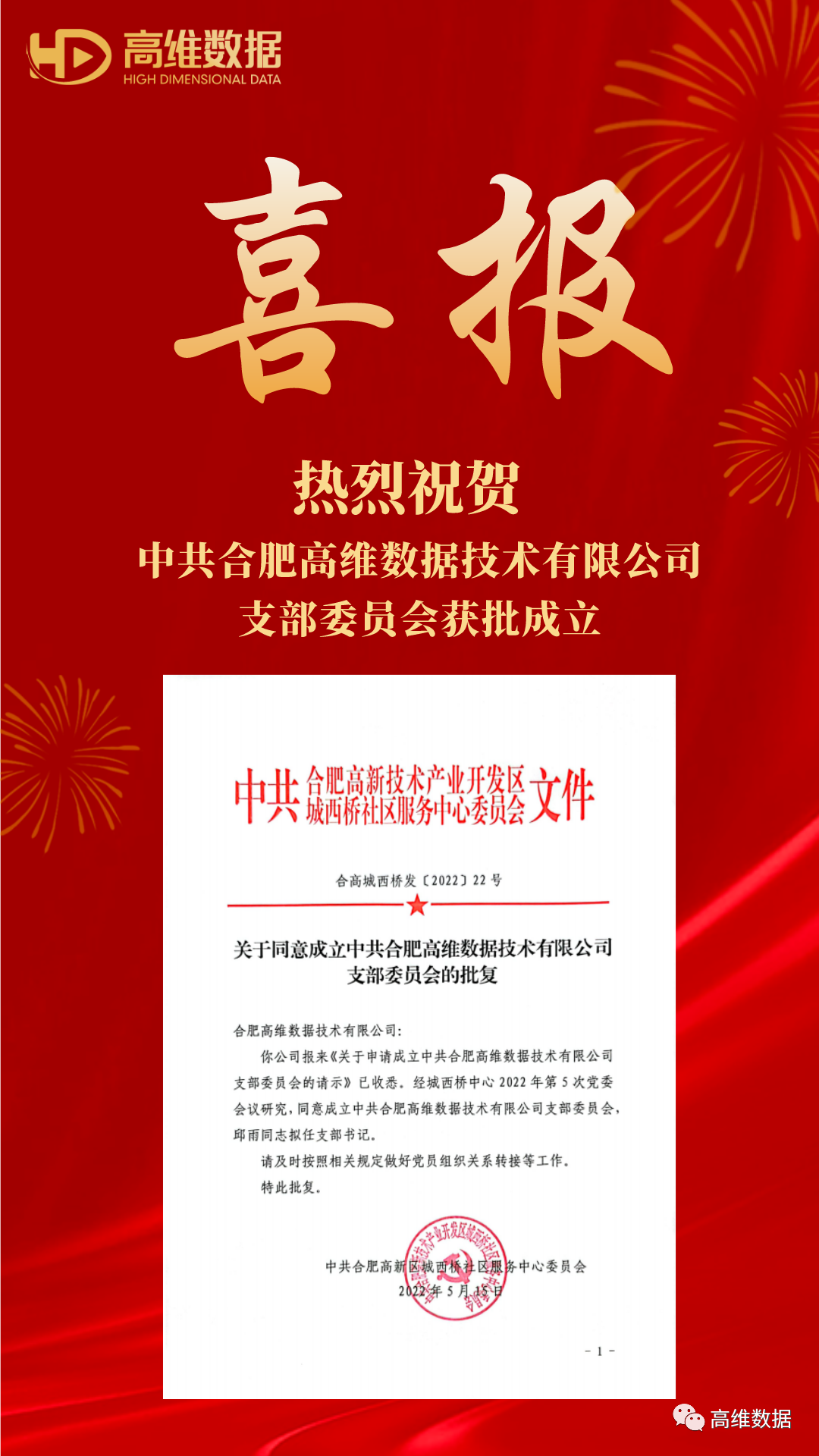 中共合肥高维数据技术有限公司支部委员会成立于2022年5月,现有正式党员5名。 合肥高维数据技术有限公司党支部是隶属于合肥高新区城西桥社区服务中心党委,在党委领导下,切实把党建工作与企业发展有机结合,围绕公司核心工作,充分发挥党组织的政治引领作用和党员的先锋模范作用。 公司党支部的成立是公司全体党员政治生活中的一件大事,也是强化支部党员党性和增强党员意识的重要抓手。党支部以创建品牌党建为目标,充分发挥党员在日常工作、学习研究、工作纪律、职能支撑等方面的先锋模范作用。
