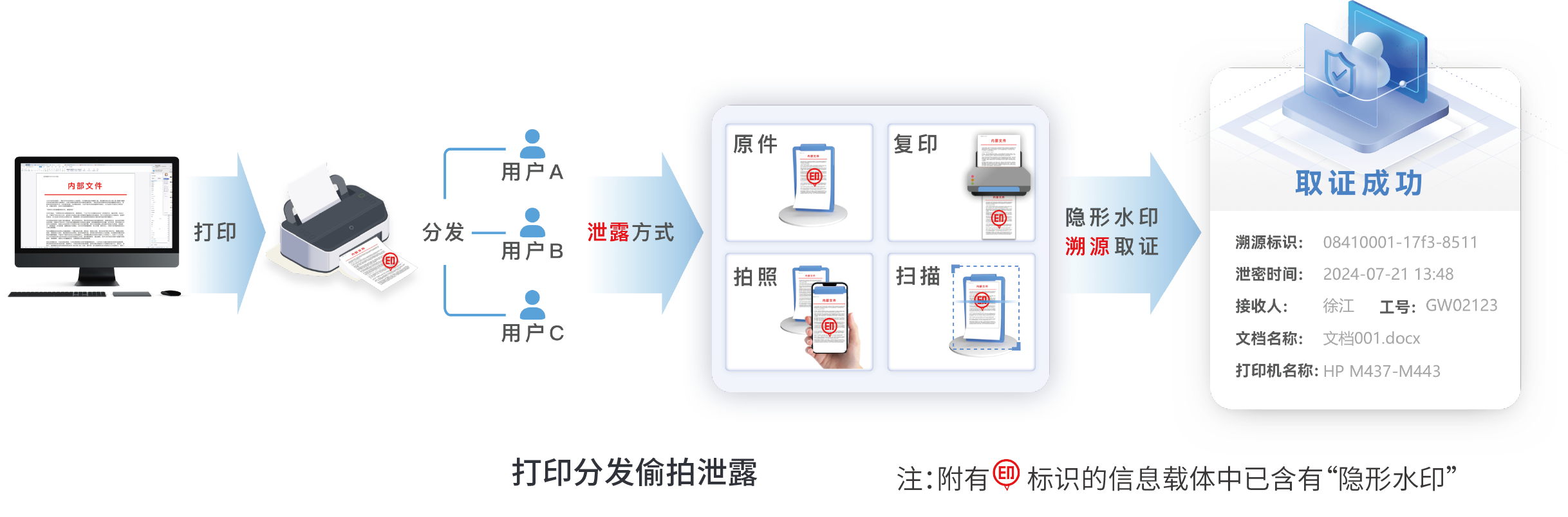 系统主要解决打印文件被偷拍、复印、扫描导致的数据泄露问题。产品在打印输出的文档文字中隐藏无感知的溯源信息,对泄露的打印件、复印件、扫描件、照片等进行溯源信息的提取,精准定位纸质文件泄露源头,实现对纸质文档打印、复印和拍照行为的安全管理。