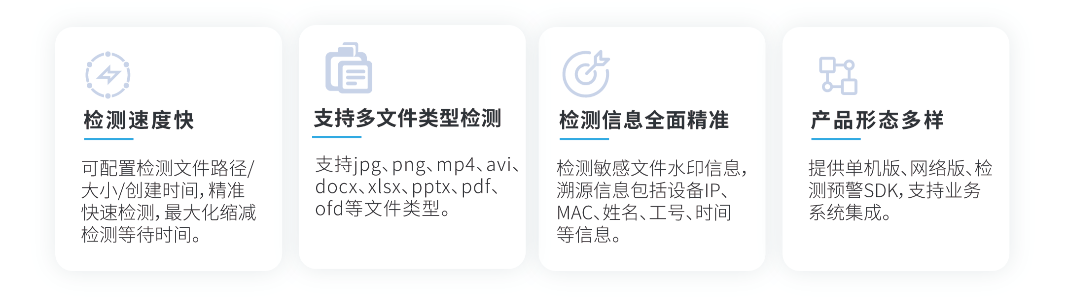 系统主要用于解决数据泄露行为发生时预警发现问题。通过对内部管控手机偷拍数据、外携手机/Pad/电脑/U盘设备存储数据、互联网流转数据进行检测,筛查出含水印信息的图片、视频、电子文档,发现可疑的泄露信息,实现泄露数据的主动发现,在泄露事件进一步扩散前进行有效预警。