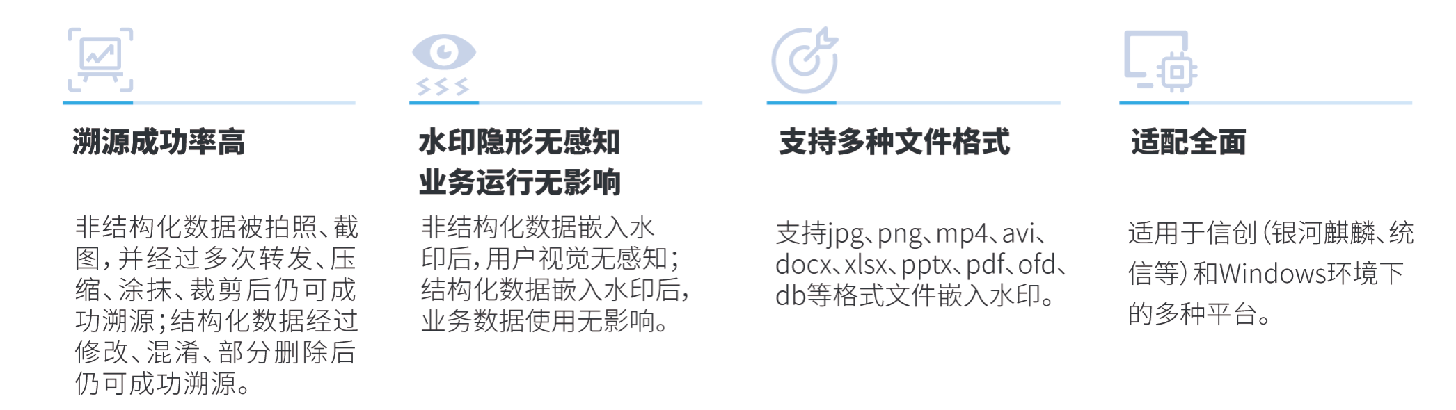 系统主要用于解决结构化数据(数据库数据)和非结构化数据(电子文档、图片、视频)流转的安全管控问题。通过将隐形水印信息嵌入到原始数据中,优化数据内部管控和分发流程,通过数据的外发行为发现、隐形水印嵌入、外发行为审计与泄露溯源等功能的组合,实现电子数据安全流转管控。