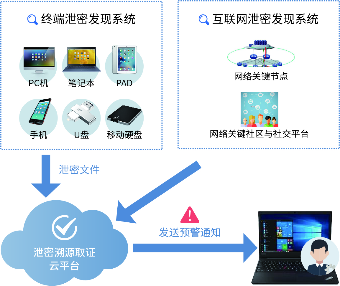 泄密发现系统是一套对终端设备(计算机、智能手机、U盘和移动硬盘等存储设备)及互联网信息(网络关键节点数据、关键社区数据、社交平台数据)进行检测,发现可疑泄密资料的检查工具。本系统针对安全标识信息、文件流转信息、隐蔽信息的特征,应用深度学习目标检测算法,识别出可疑泄密资料,并上传溯源取证云平台进行分析,实现泄密数据的主动发现,在泄密事件近一步扩散之前进行有效预警。