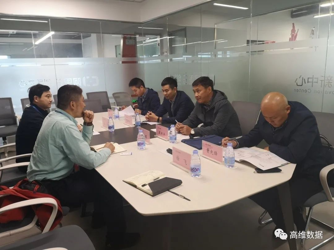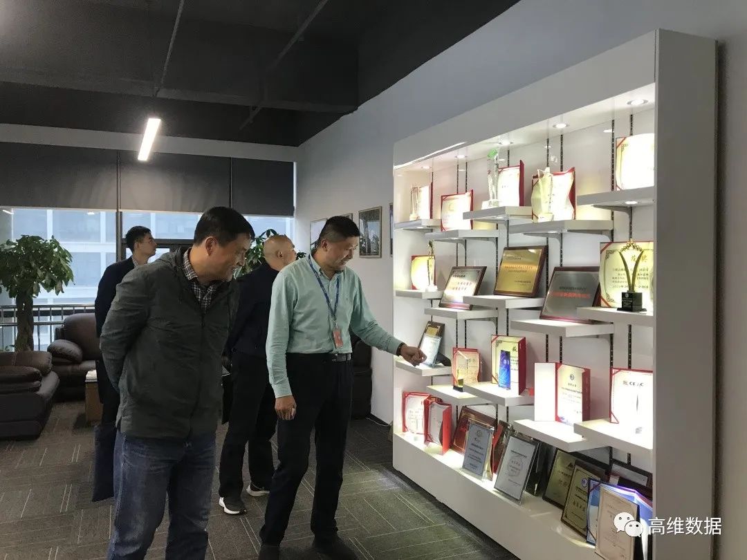 高维数据创始人田辉为周丰平副局长、张新宏处长一行介绍公司产品获得的荣誉证书。周丰平副局长对高维数据的新理念、新技术、新产业给予了充分肯定,并就公司创新产品的市场发展等给予指导。