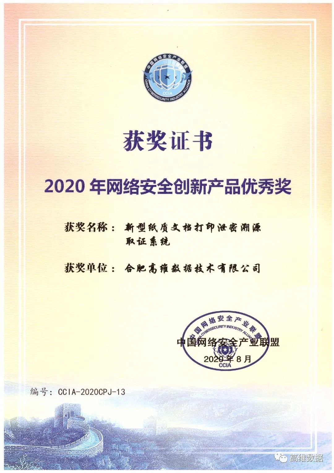 8月15日,中国网络安全产业联盟(CCIA)发布了《关于“2020年优秀网络安全解决方案和网络安全创新产品评选活动”获奖名单》。在经过网安行业知名专家、投资机构等初审和复评,结合网络投票情况,高维数据“新型纸质文档打印泄密溯源取证系统“获“2020年网络安全创新产品优秀奖”。是继“屏幕拍摄泄密溯源取证系统”获得“2019年网络安全创新产品优秀奖”和”最具投资价值奖“后,公司再获国内网安专家认可。