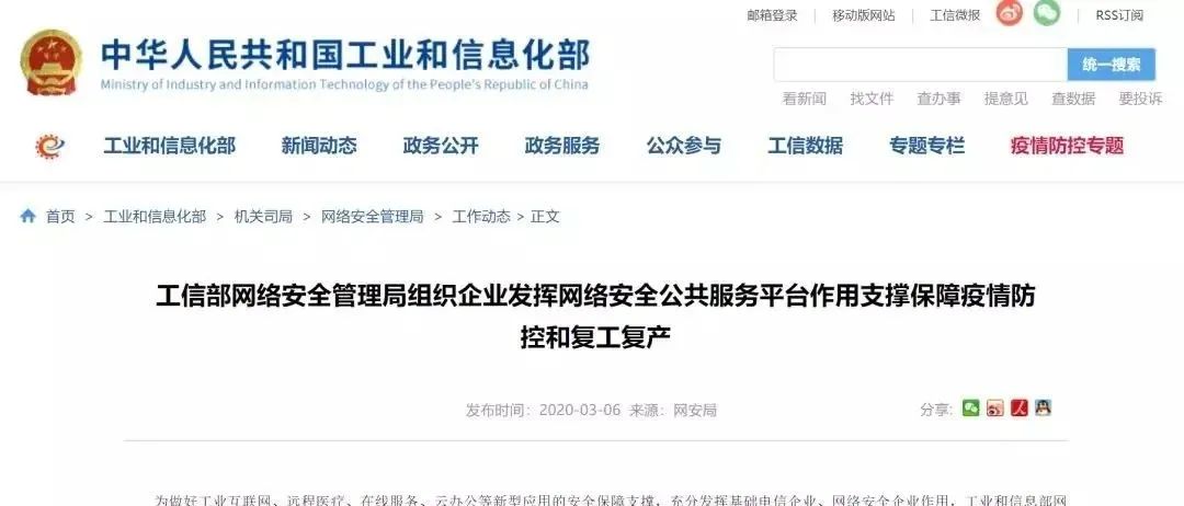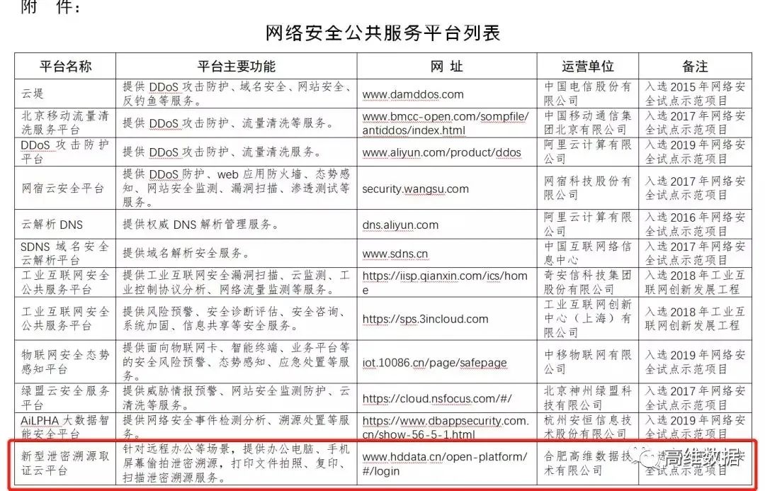 3月6日,工信部官网站发布信息,推荐了中国移动、中国电信、阿里云、奇安信、高维数据等21个网络安全服务平台,向社会提供网络安全相关服务,支撑保障疫情防控和复工复产。高维数据“新型泄密溯源取证云平台”入选,支持企事业单位在疫情复工期间解决远程复工时PC/手机屏幕拍摄泄密,文档打印/复印/拍照泄密等难题。