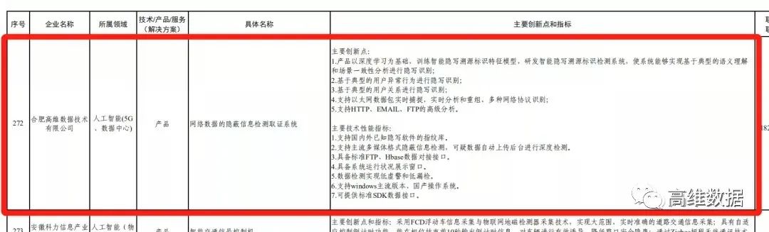 5月29日,安徽省正式发布全国首个新基建领域技术产品服务目录。高维数据申报的“屏幕拍摄溯源取证系统”、“网络数据隐蔽信息检测取证系统”等4个涉及5G、工业互联网、人工智能的创新产品成功入选!