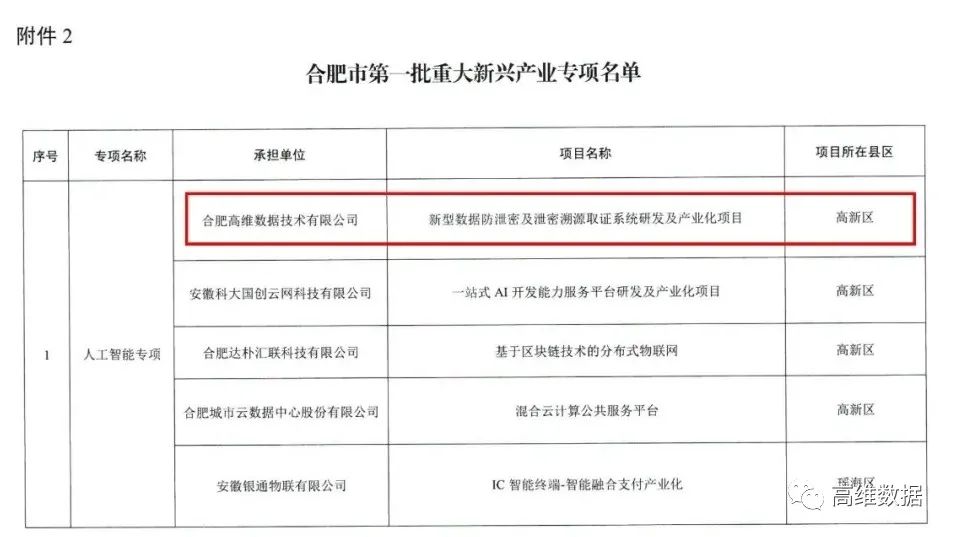 2月24日,《合肥市第一批重大信息产业工程和重大新兴产业专项名单》公布,高维数据《新型数据防泄密及泄密溯源取证系统研发及产业化项目》获得合肥市第一批重大新兴产业专项---人工智能专项的支持。