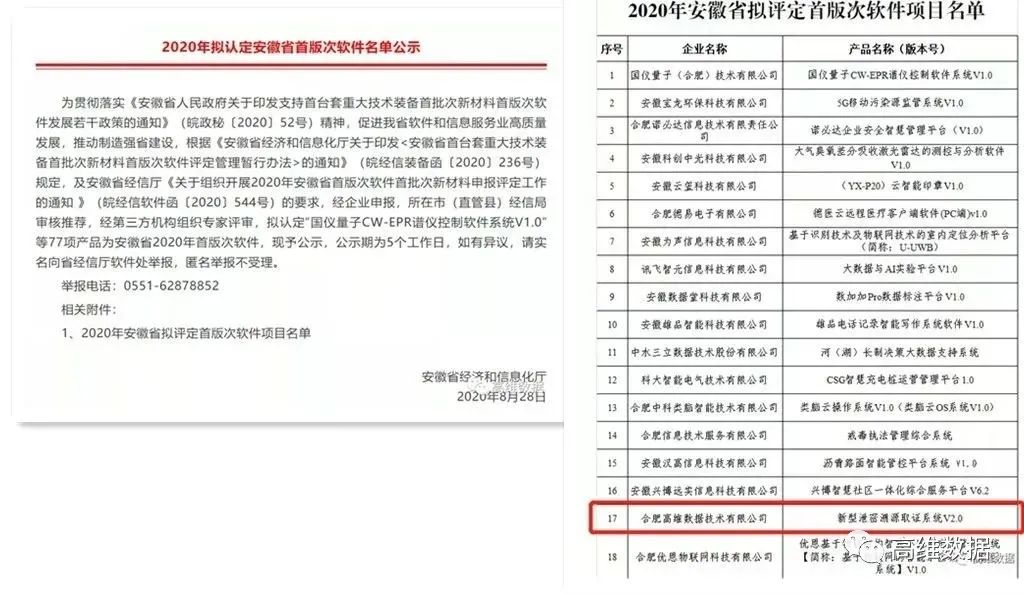 8月28日,安徽省经济和信息化厅官网发布“2020年安徽省拟评定首版次软件项目名单”,全省共77个产品入选。高维数据新产品“新型泄密溯源取证系统V2.0”入选