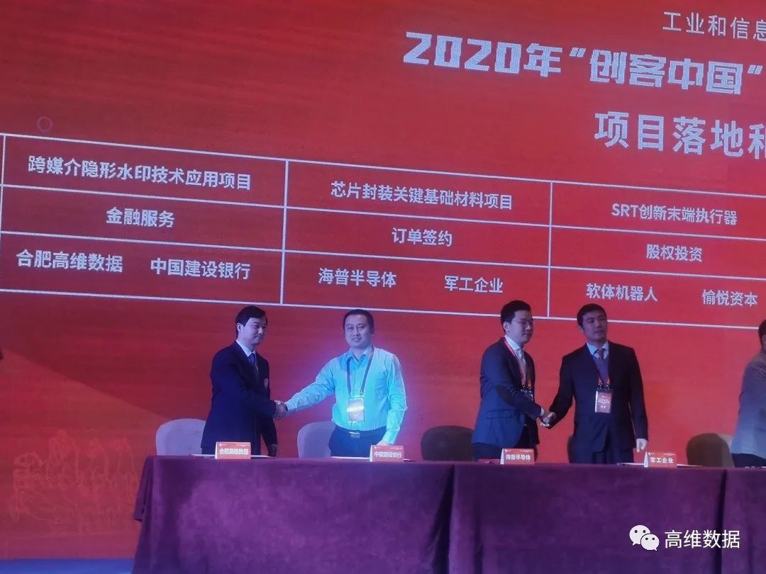 10月15日,在河南-洛阳 2020年“创客中国”全国总决赛开幕式上,合肥高维数据依托公司刚刚获得的“创客中国”安徽赛区一等奖项目--“跨媒介隐形水印技术应用项目”与中国建设银行签署合作协议,未来将在融资、贷款、结算等方面展开深入合作。工业和信息化部、财政部、河南省人民政府、安徽省经济和信息化厅等相关领导共同出席和见证签约活动。