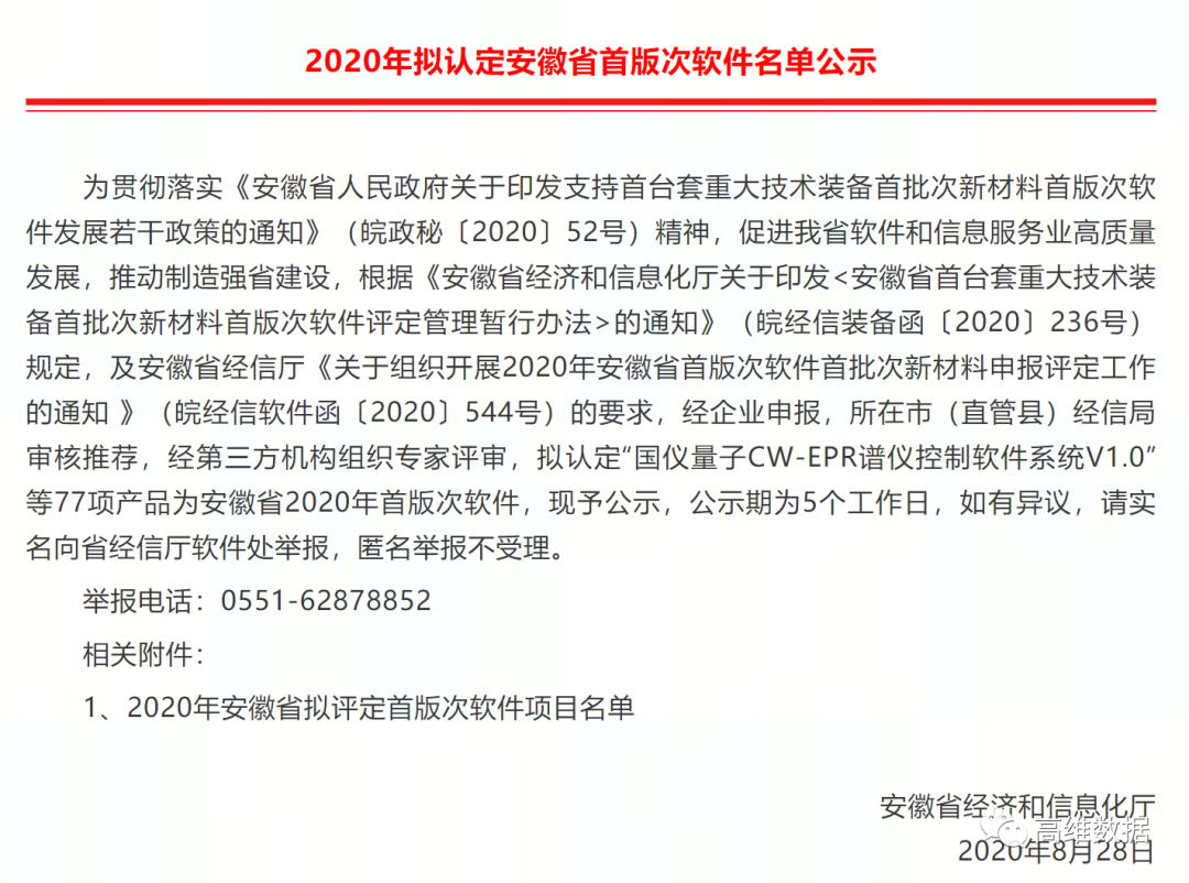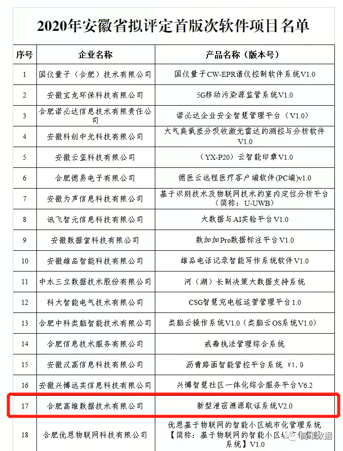 日前,安徽省经济和信息化厅官网发布“2020年安徽省拟评定首版次软件项目名单”,经市(直管县)经信局审核推荐,第三方机构组织专家评审,全省最终共77个产品入选。高维数据新产品“新型泄密溯源取证系统V2.0”入选。