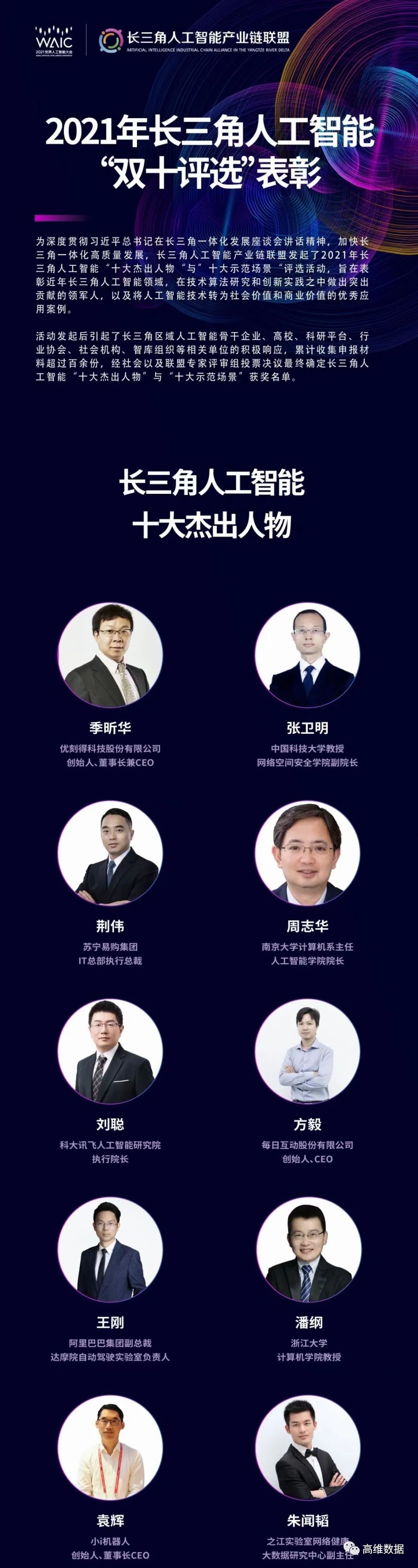 浙江大学计算机学院教授潘纲,中国科学技术大学教授张卫明,南京大学教授周志华,之江实验室健康大数据研究中心副主任朱闻韬等专家学者,科大讯飞人工智能研究院执行院长刘聪,苏宁易购集团IT总部执行总裁荆伟,阿里巴巴集团副总裁、达摩院自动驾驶实验室负责人王刚,每日互动创始人方毅,小i机器人创始人袁辉,优刻得创始人季昕华等产业代表,荣获长三角人工智能十大杰出人物,横跨产学研多个领域。