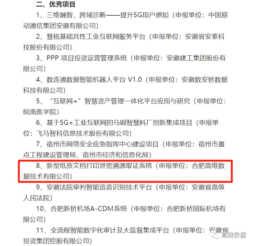 为深入贯彻落实习近平新时代中国特色社会主义思想,学习贯彻党的十九大和十九届二中、三中、四中、五中全会精神,坚持以习近平总书记关于网络强国的重要思想为指引,全面推进“数字江淮”建设,总结和宣传2020年度安徽省省信息化建设所取得的成果,安徽省信息化协会于3月1日发出《关于开展2020年度(第二十五届)安徽省信息化十件大事遴选工作的函》(皖信协函〔2021〕1号)。经过初评和专家评审的规定程序,遴选出“十件大事”十项、“优秀项目”二十二项。高维数据“新型纸质文档打印泄密溯源取证系统”入选2020年度安徽省信息化优秀项目!