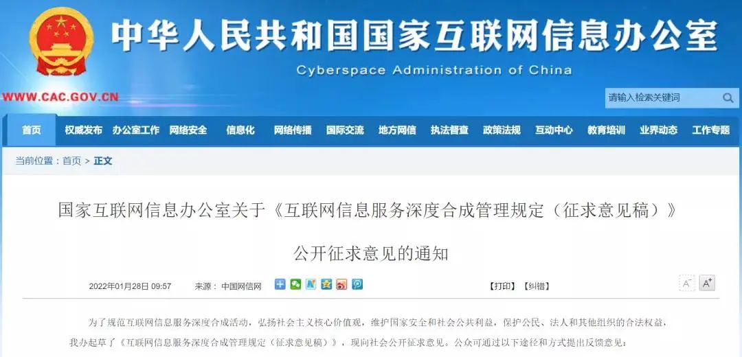 1月28日,国家互联网信息办公室发布关于《互联网信息服务深度合成管理规定(征求意见稿)》公开征求意见的通知,依据网安法、数安法、个保法等法律要求规范应用深度合成技术提供互联网信息服务的信息安全义务,意见反馈截止日期为2月28日。