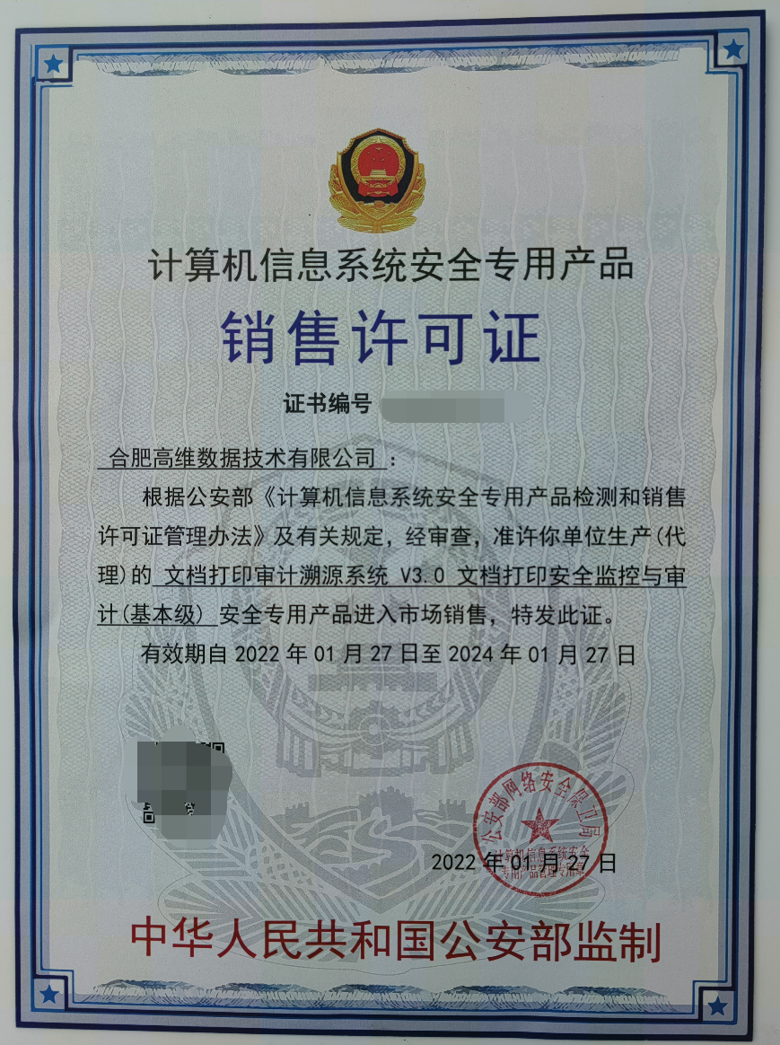 近日,由合肥高维数据技术有限公司自主研发的 “文档打印审计溯源系统 V3.0 文档打印安全监控与审计” 产品顺利通过公安部计算机信息系统安全产品质量监督检验中心的标准测评及相关审查,获《计算机信息系统安全专用产品销售许可证》。