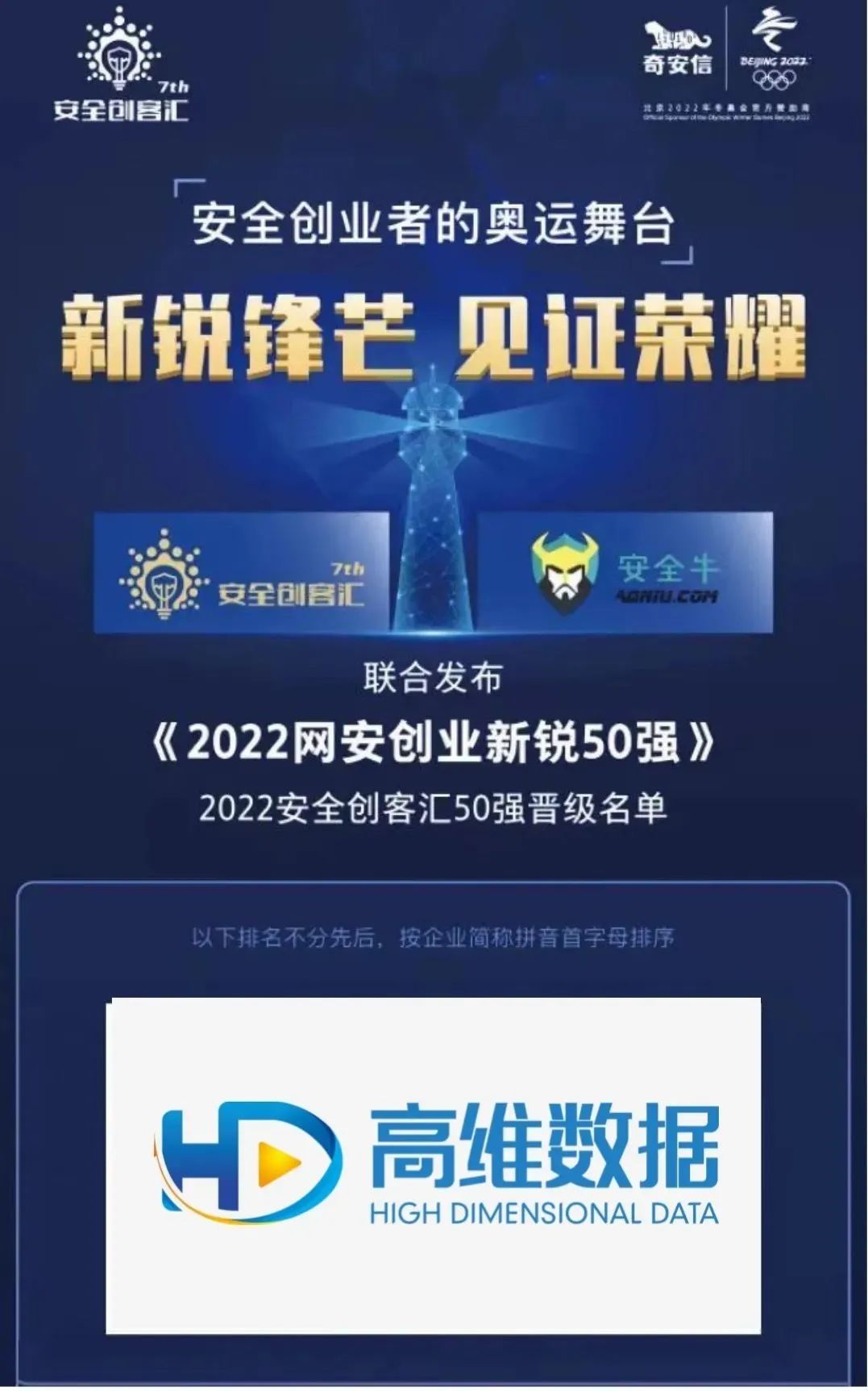 2022年4月29日,由奇安信集团、北京网络安全大会(BCS)、全国网络信息安全创业投资服务联盟(筹)、奇安投资联合主办的2022第七届网络安全创客汇初赛顺利收官,高维数据作为“隐私安全、数字取证”的新型网络安全公司,成功入选《2022网安创业新锐50强》!