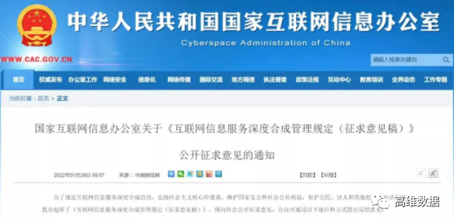 1月28日,国家互联网信息办公室发布关于《互联网信息服务深度合成管理规定(征求意见稿)》公开征求意见的通知。