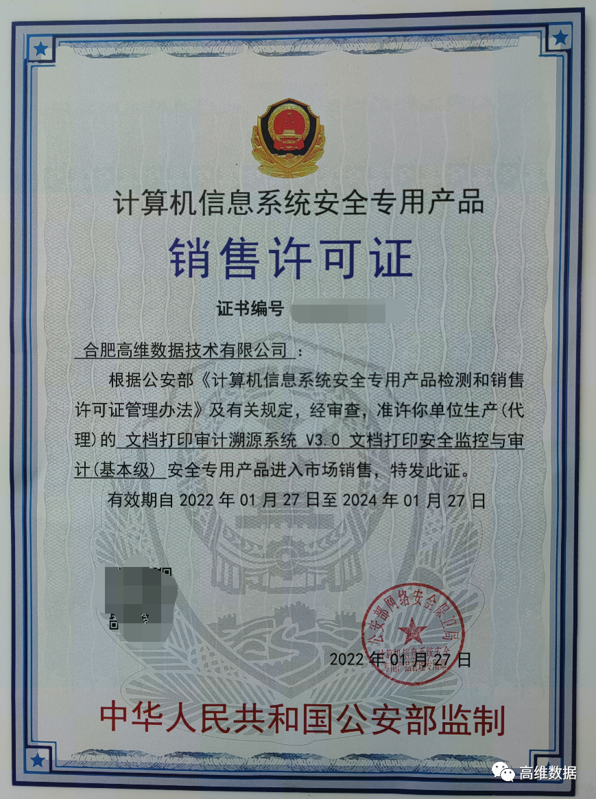 1月27日,由合肥高维数据技术有限公司自主研发的 “文档打印审计溯源系统 V3.0 文档打印安全监控与审计” 产品顺利通过公安部计算机信息系统安全产品质量监督检验中心的标准测评及相关审查,获《计算机信息系统安全专用产品销售许可证》。