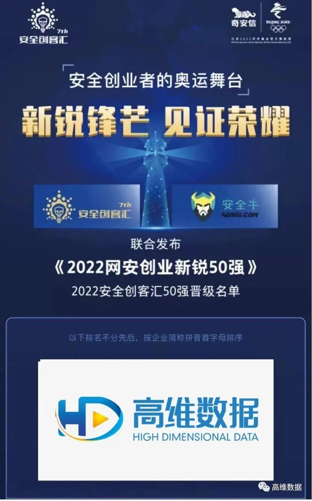 2022年4月29日,由奇安信集团、北京网络安全大会(BCS)、全国网络信息安全创业投资服务联盟(筹)、奇安投资联合主办的2022第七届网络安全创客汇初赛顺利收官,高维数据作为“隐私安全、数字取证”的新型网络安全公司,成功入选《2022网安创业新锐50强》!