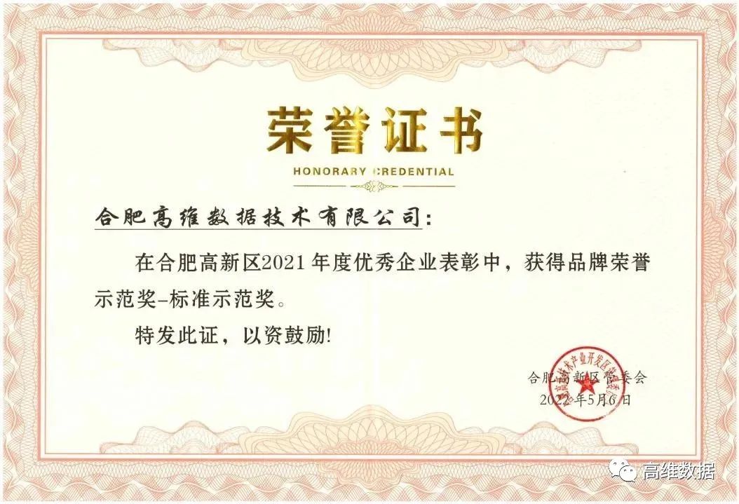 6月10日下午,合肥高新区召开2022年企业表彰大会,对过去一年为高新区经济发展作出突出贡献的优秀企业和个人进行表彰。高维数据荣获合肥高新区“标准示范奖”称号!