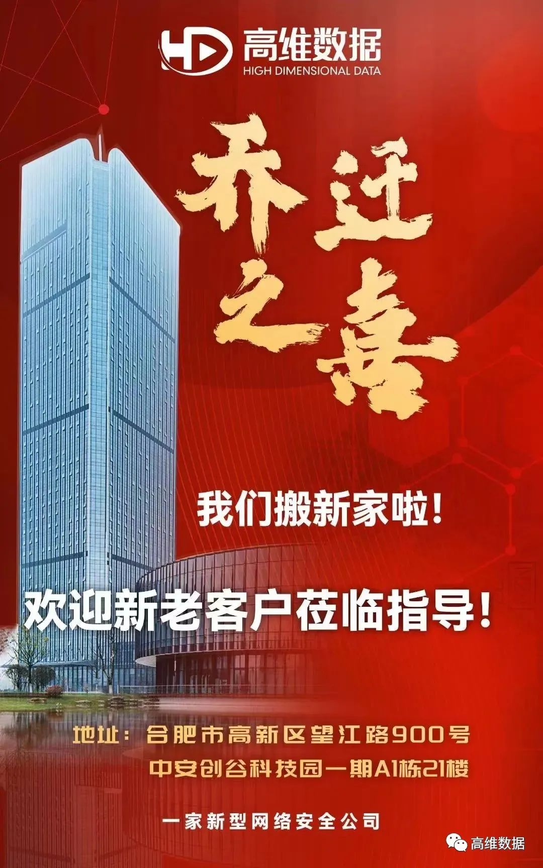 1月22日,高维数据正式启用新址(合肥高新区中安创谷产业园一期A1栋21层),新建了沉浸式体验展厅,期待新老客户、良师益友莅临指导!