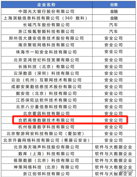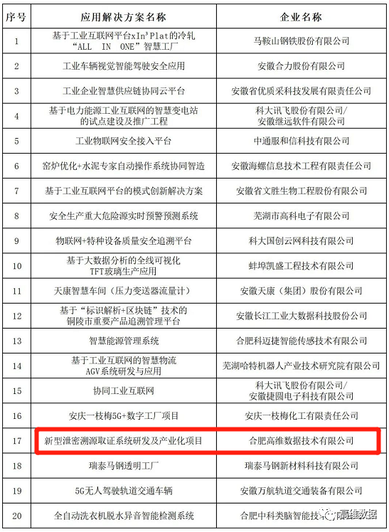 3月28日,根据《安徽省工业互联网创新发展行动计划(2021-2023年)》相关政策文件要求,在安徽省经济和信息化厅指导下,安徽工业互联网产业联盟组织开展了2021年度安徽省“优秀工业互联网应用解决方案”评选工作,其中,高维数据《新型泄密溯源取证系统研发及产业化项目》成功进入公示名单。