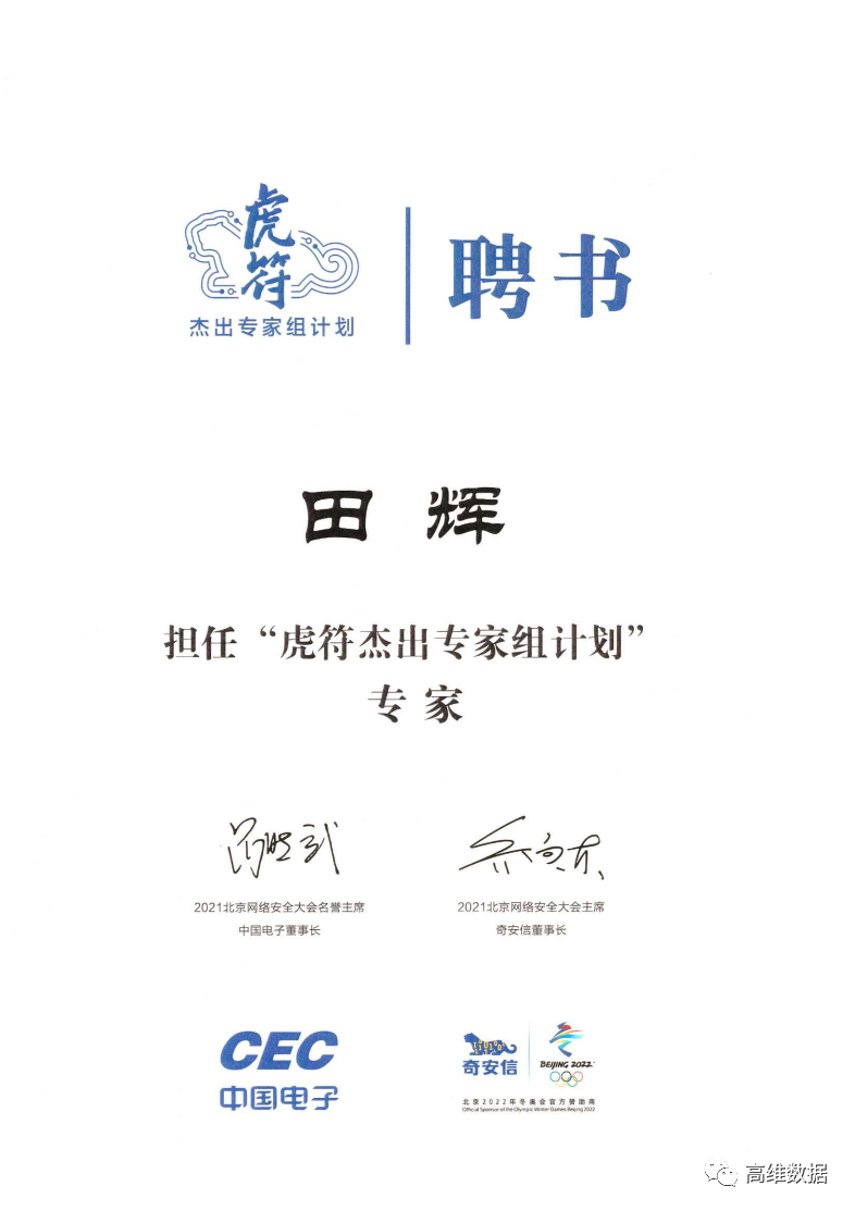 日前,经北京网络安全大会(BCS)常设专家委员会评审,高维数据总经理田辉受聘担任“虎符杰出专家组计划”专家。