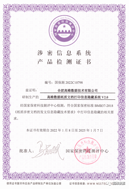 由公司自主研发的 “高维数据纸质文档打印信息隐藏系统V2.0” 产品顺利通过国家保密科技测评中心检测,符合国家保密标准BMB37-2018《纸质涉密文档的发文信息隐藏技术要求》中打印信息隐藏的相关要求,获《涉密信息系统产品检测证书》!