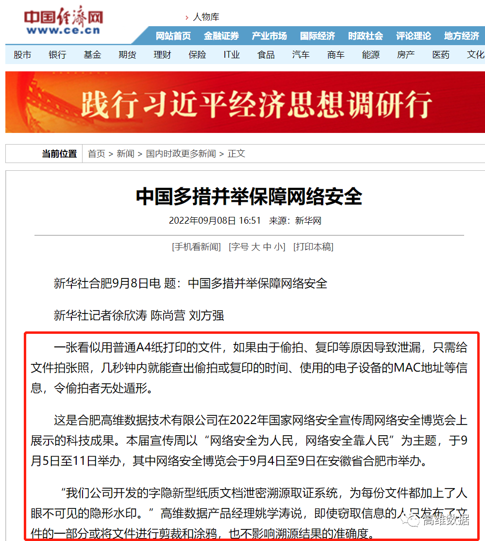 【中国经济网以《中国多措并举保障网络安全》、《自主网络安全技术亮相合肥》等文章,关注公司新产品、新技术。