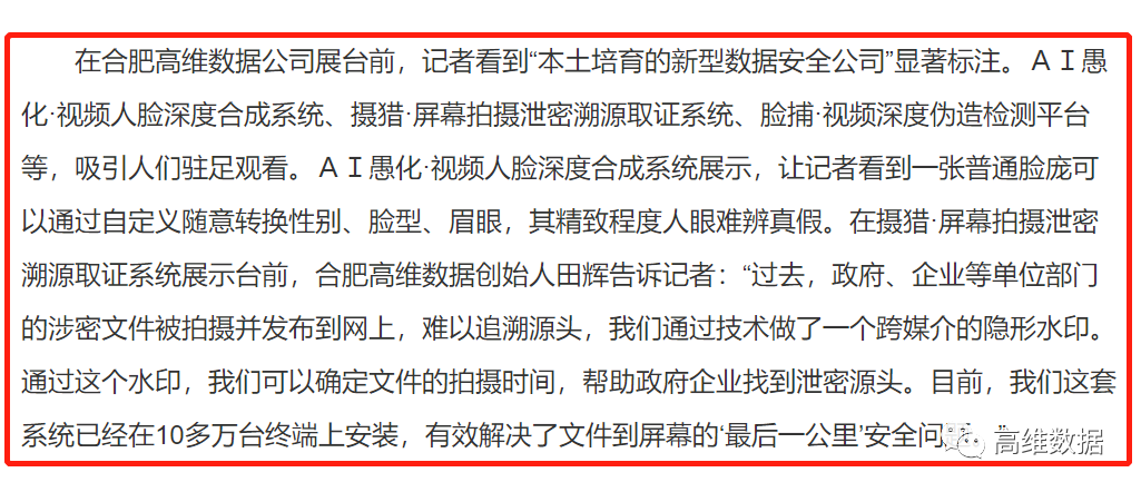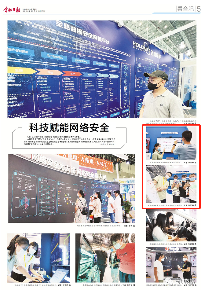 作为本土培育的新型数据安全公司,合肥高维数据技术有限公司携系列新型数据安全创新产品参展,并受到广泛关注,多家主流中央主流媒体,地方媒体、大型网络媒体等众多媒体聚焦报道、关注高维数据。