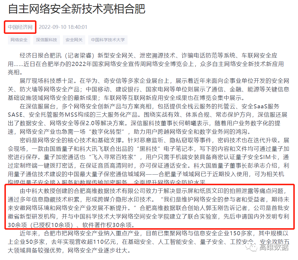 【经济日报以《自主网络安全技术亮相合肥》为题,采访公司联合创始人郭玉刚。】
