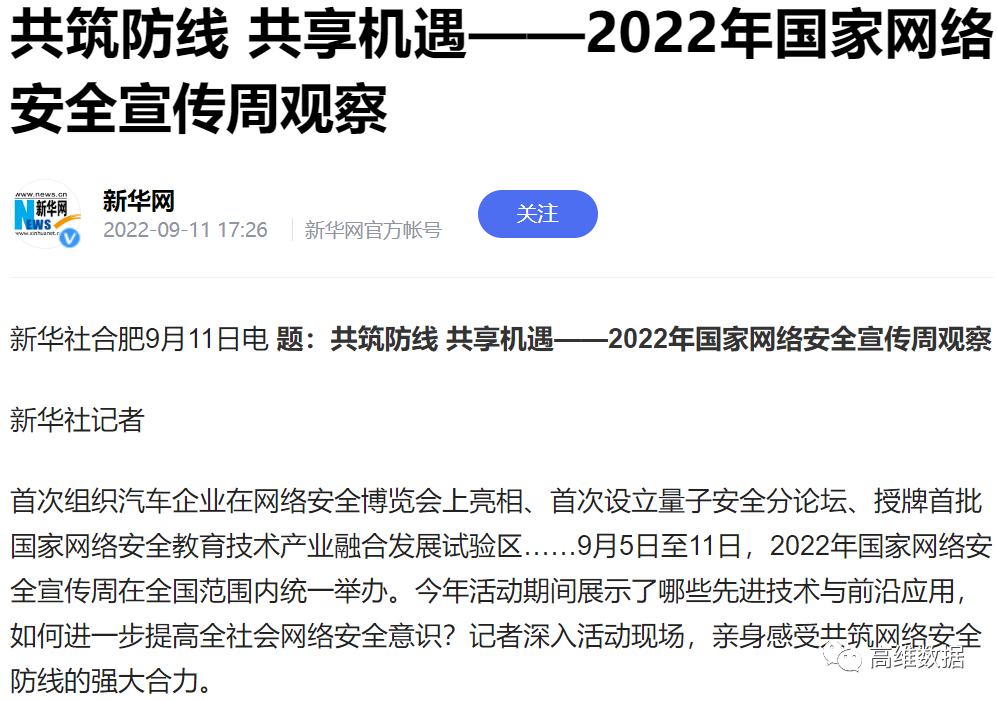2022网安周已圆满落幕,让我们一起来回顾那些关注过高维数据的媒体报道内容吧!