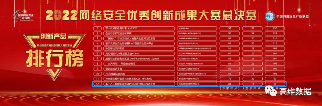 为表彰网络安全产业优秀创新成果,论坛举行了“2022年网络安全优秀创新成果大赛”颁奖仪式。在“2022年网络安全优秀创新成果大赛”中,高维数据申报的“基于人工智能的多媒体内容深度合成与检测平台”新产品经过复赛、半决赛、决赛等多轮比拼,得到网络安全界业内专家评委及投资人的认可,获“2022年网络安全创新产品优秀奖三等奖”。
