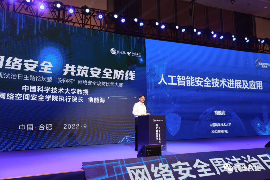 9月8日上午,2022年国家网络安全宣传周法治日系列活动在合肥举行,本次活动以“维护网络安全,共筑安全防线”为主题,由公安部网络安全保卫局指导、安徽省公安厅主办、合肥市公安局承办。公安部网安局警务技术二级总监黄小苏,安徽省公安厅副厅长张东明,合肥市副市长、市公安局局长刘卫宝等领导致辞。中国科学技术大学网络空间安全学院执行院长、公司首席科学家俞能海发表《人工智能安全新技术及应用》演讲,向来自全国公安系统客户分享了公司在人工智能安全方面的创新技术与应用场景,获得公安行业用户的热烈反响。
