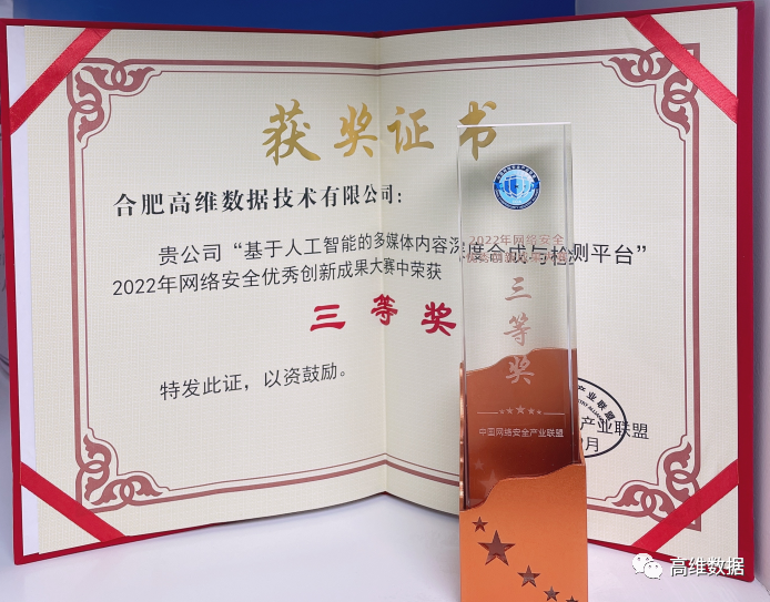 本次论坛的重要活动之一,“2022年网络安全优秀创新成果大赛”颁奖典礼成功举办,现场颁发了创新方案和创新产品奖项,高维数据申报的“基于人工智能的多媒体内容深度合成与检测平台” 获得三等奖。