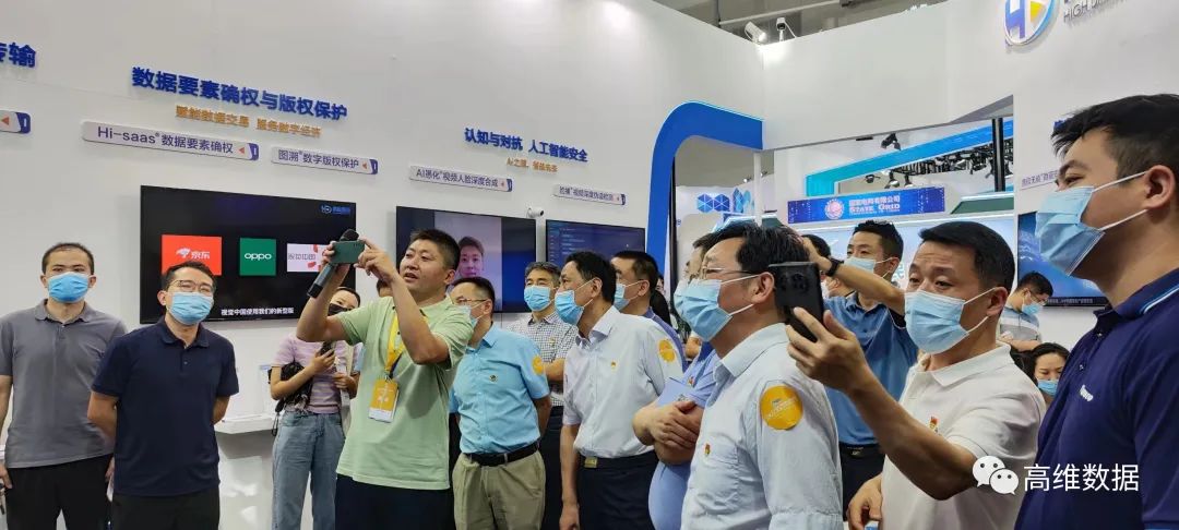 1►中央网信办副主任赵泽良,省委常委、合肥市委书记虞爱华,省委网信办主任张杰华等领导一行莅临高维数据展位参观。长时间听取公司汇报,并现场体验公司新型泄密溯源取证、AI实时换脸等产品,并给予充分认可与积极鼓励。