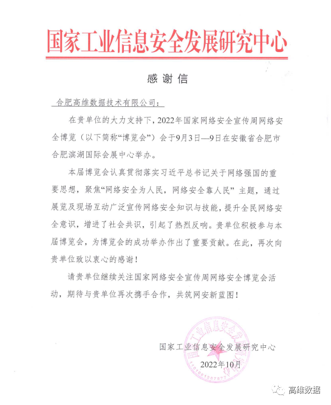 日前,高维数据收到来自一封国家工业信息安全发展研究中心的感谢信,对公司积极参与2022年国家网络安全宣传周网络安全博览会给予高度评价!