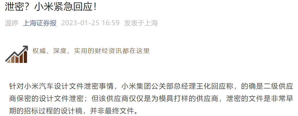 日前,上海证券报官微发布了小米汽车设计文件提前遭泄露的信息,针对本次泄密事情,小米集团公关部总经理王化进行了正面回应,并表示将严肃处理相关供应商。