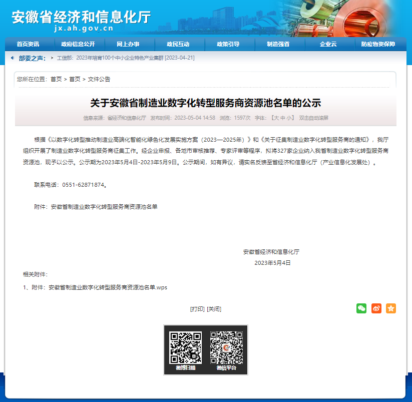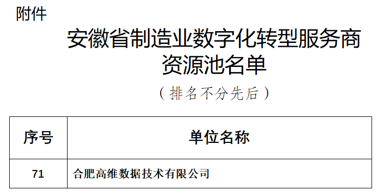 近日,安徽省经济和信息化厅发布《关于安徽省制造业数字化转型服务商资源池名单的公示》,经企业申报、各地市审核推荐、专家评审等程序后,合肥高维数据技术有限公司成功入选!