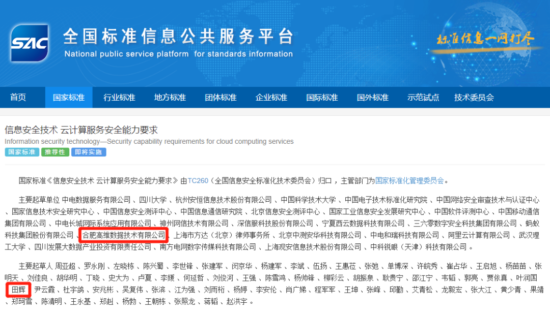 5月23日,合肥高维数据技术有限公司参与起草的一项国家标准GB/T 31168-2023《信息安全技术 云计算服务安全能力要求》正式发布,并将于12月1日正式实施。