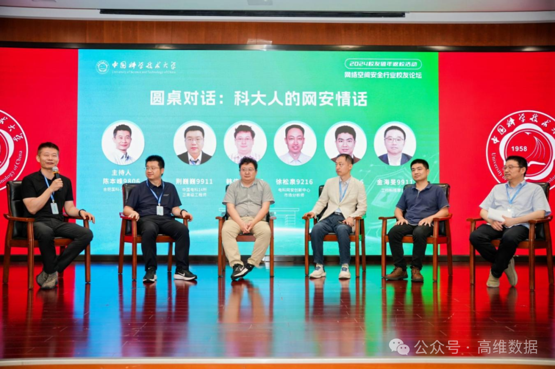 圆桌论坛由9806级校友陈本峰主持,分享嘉宾电科网安创新中心市场分析师徐松泉(9216)、复旦大学教授韩伟力(9307)、中国科学技术大学网络空间安全学院教授林璟锵(9606)、工行科技部总助金海旻(9911)、中国电科14所正高级工程师荆巍巍(9911)围绕“科大人的网安情话”展开对话,大家各自分享了在科大的学习经历,结合工作实际,畅谈了科大对自己的职业发展以及取得的成就产生的影响,并对网络空间安全学院的建设、中国科大网安事业发展建言献策。