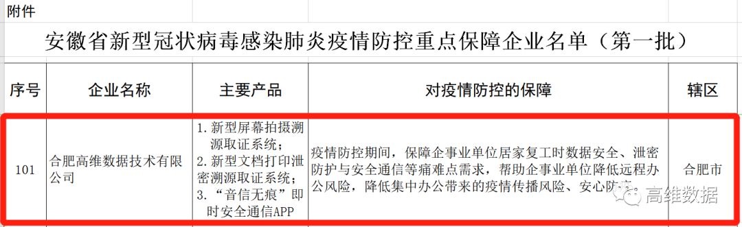 高维数据被列入安徽省疫情防控重点保障企业(第一批)!