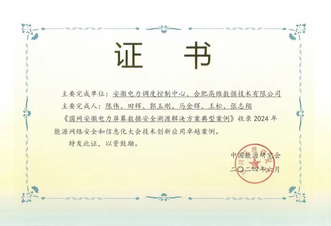 日前,中国能源研究会发布2024年能源网络安全和信息化大会技术创新应用案例名单,由安徽电力调度控制中心与合肥高维数据联合申报的《国网安徽电力屏幕数据安全溯源解决方案典型案例》脱颖而出收录至2024年能源网络安全和信息化大会技术创新应用卓越案例!
