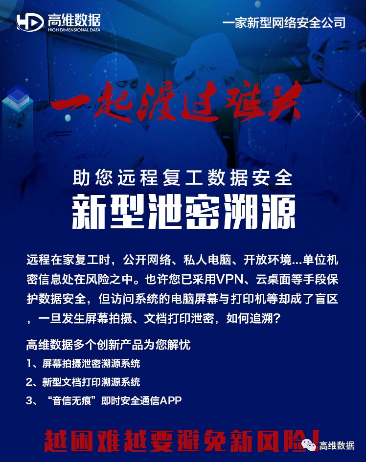 疫情来袭,居家战疫,很多单位开启远程复工模式。在家复工时,公开网络、私人电脑、开放环境...单位机密信息处在风险之中。也许您已采用VPN、云桌面等手段保护数据安全,但远程接入单位系统的电脑屏幕与打印机等却成了更大的安全管理盲区,一旦发生屏幕拍摄、文档打印泄密事件,如何有效追溯?越困难,越要努力避免新风险!高维数据“跨媒介隐形水印”创新技术解决您的忧虑,助您远程复工数据安全共克时艰,一起渡过难关!
