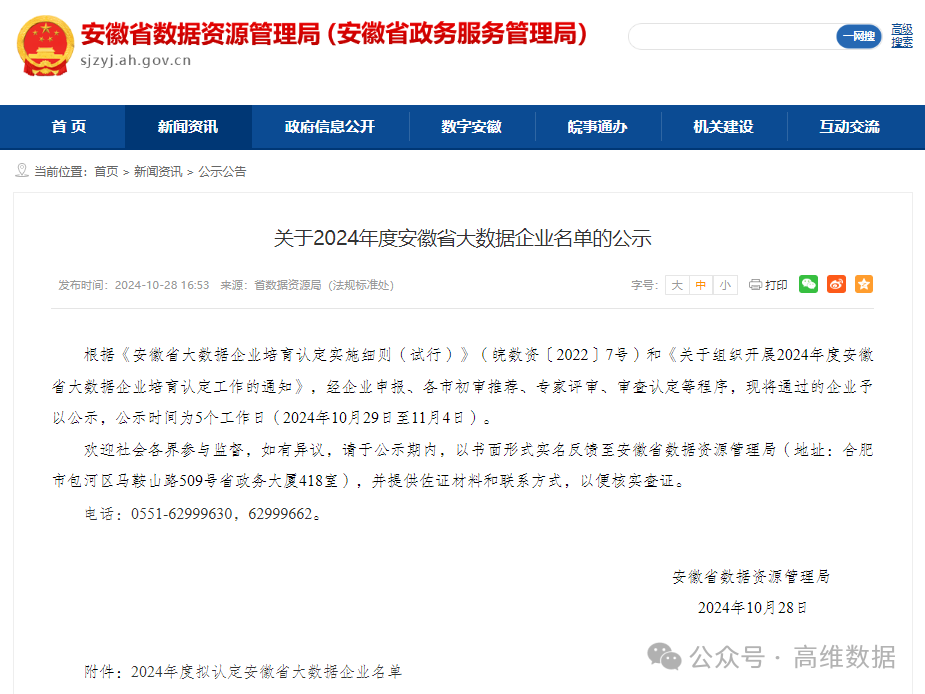 近日,安徽省数据资源管理局发布2024年安徽省大数据企业认定名单。经各市初审推荐、专家评审、审查认定等程序,高维数据成功入选名单!