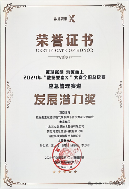在安徽省分赛和全国总决赛中,本项目基于数据要素的“禹域WIM平台”的城市防洪除涝应急管理方案得到了专家评委的高度赞誉。评委们认为,该方案在技术创新、实际应用效果及市场前景等方面均表现出众,为城市防洪安全提供了有力支撑。同时,基于数据要素的“禹域WIM平台”的城市防洪除涝应急管理方案”在数据要素化方面展现出的强大能力,也充分体现了中水三立、博诺思、高维数据在数据要素领域的深厚积累和技术优势。