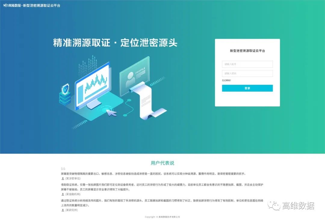 高维数据入选的“屏幕拍摄泄密溯源取证系统”解决了传统明水印、矢量水印影响视觉,易于破坏等不足,有效解决屏幕拍摄溯源难题。在出现偷拍电脑、手机、大屏等电子屏幕泄密时,可快速精准定位源头(时间、IP、MAC、工号等信息).