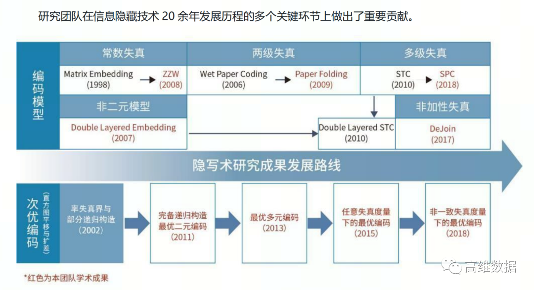 公司首席科学家俞能海教授、总工程师张卫明教授领先的信息隐藏研究团队,坚持信息隐写技术24年,是国内较早从事相关技术研究的科研团队。为国内信息隐写 及 隐写分析发展做出多个重要贡献。其中近年来团队 极化隐写码(Steganographic Polar Codes, SPC)的推出,打破了一直依赖美国STC编码的窘境,并以更高的效率、速度等性能推动国内信息隐写技术的进一步发展。