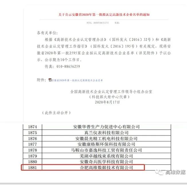 8月17日,全国高新技术企业认定管理工作领导小组办公室发布了《关于公示安徽省2020年第一批拟定高新技术企业名单的通知,合肥高维数据技术有限公司再次通过认定。