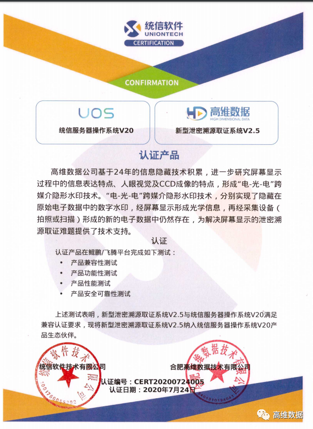 8月15日,中国网络安全产业联盟(CCIA)官网发布了《关于“2020年优秀网络安全解决方案和网络安全创新产品评选活动”获奖名单》。在经过网络安全行业知名专家、投资机构等初审和复评,结合网络投票情况,高维数据的申报的“新型纸质文档打印泄密溯源取证系统“获得业内专家评委的认可,获“2020年网络安全创新产品优秀奖”。